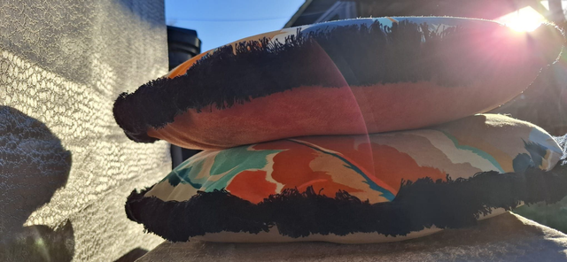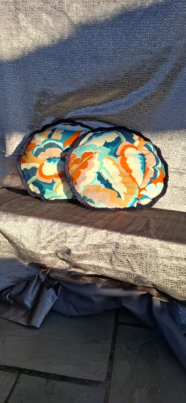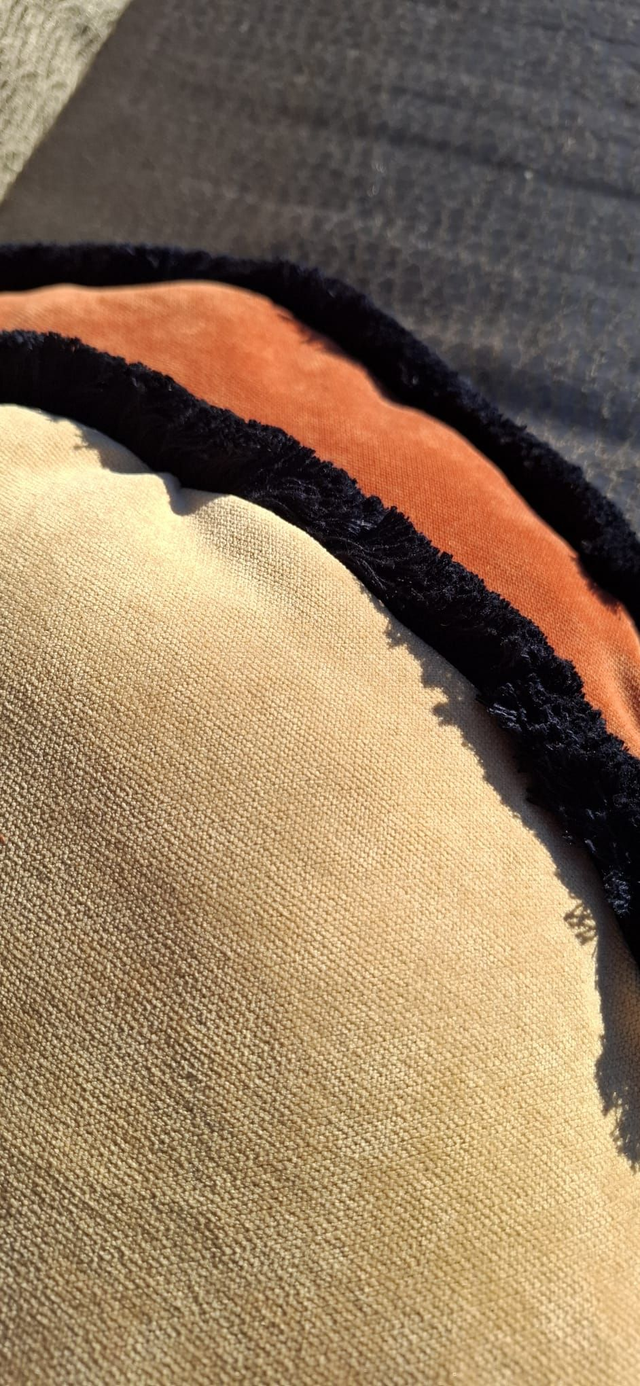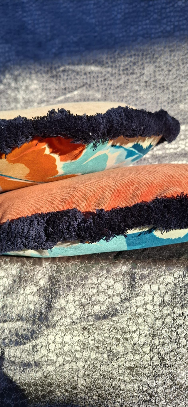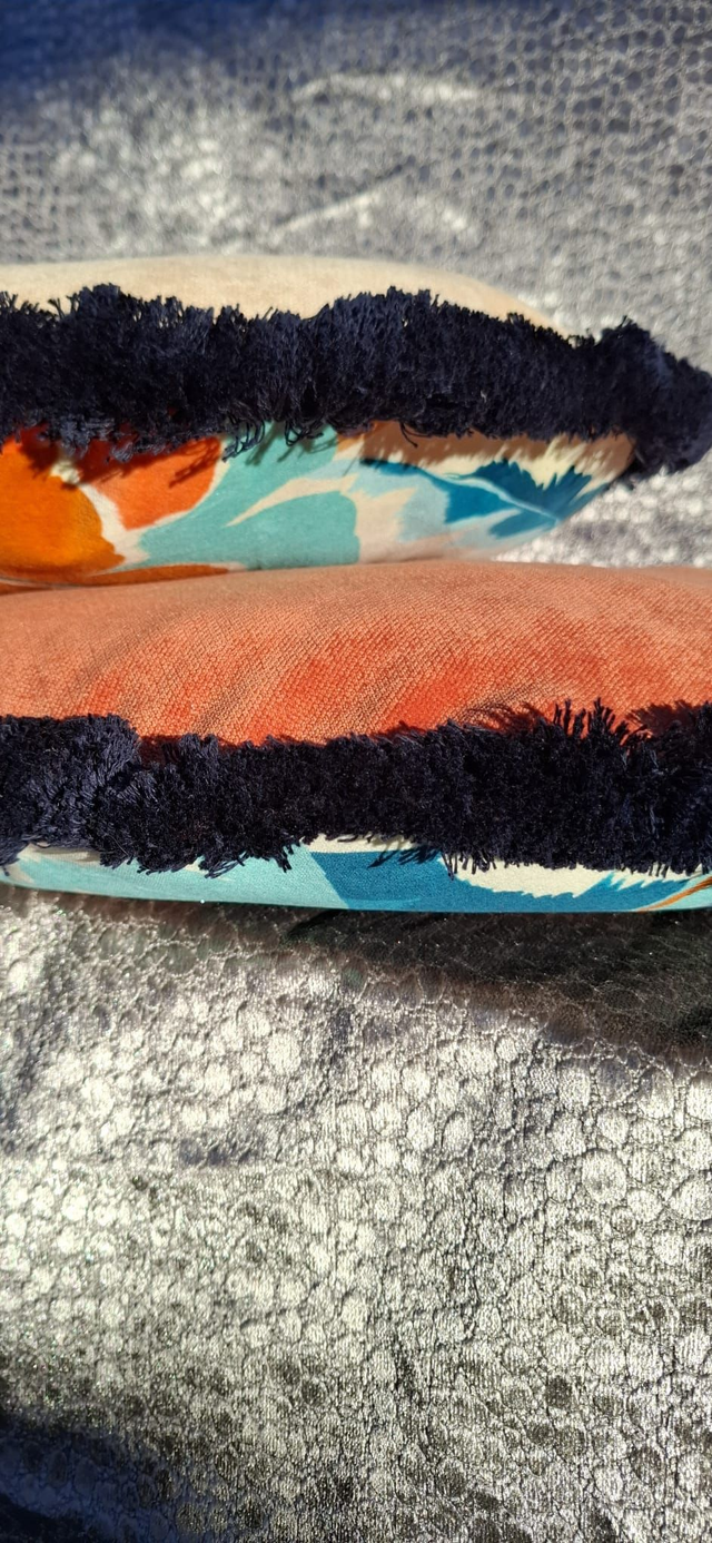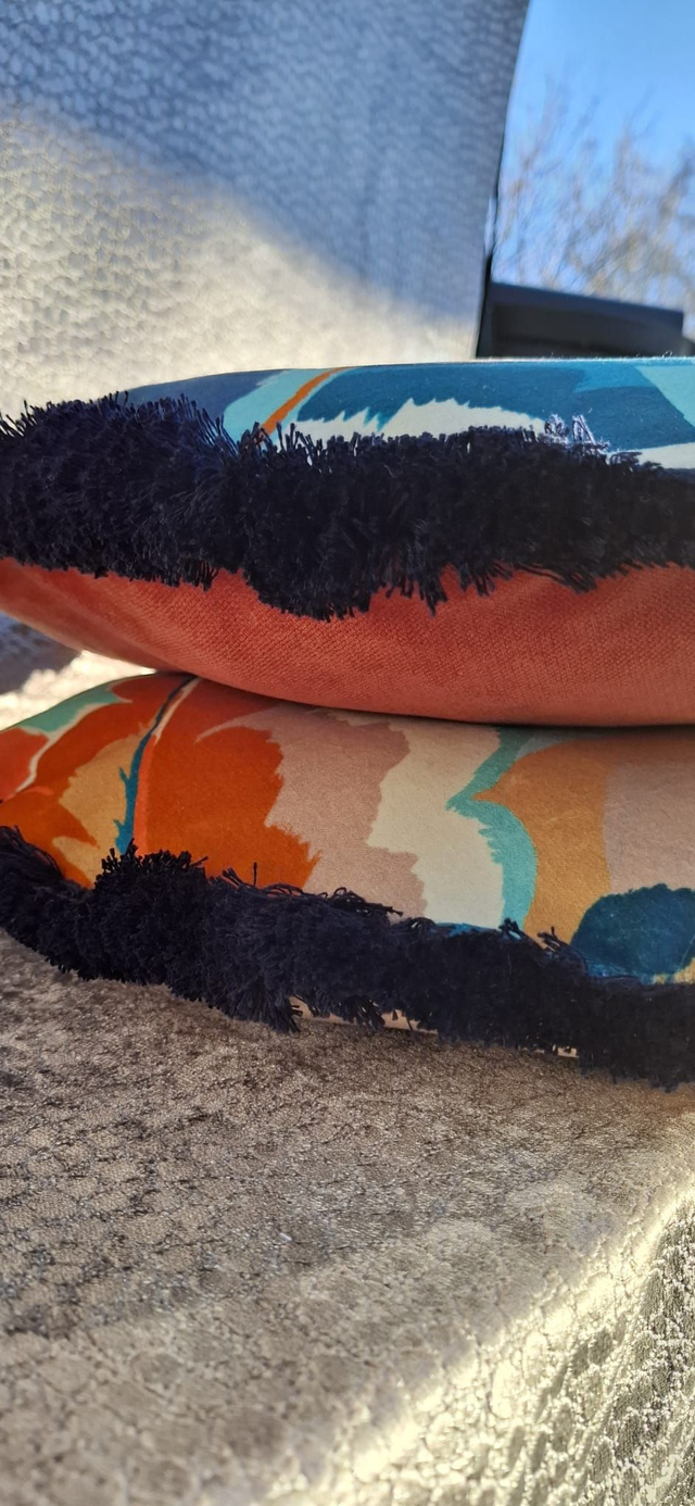 Harlequin's Calathea printed velvet, plain orange reverse and navy cotton fringe.