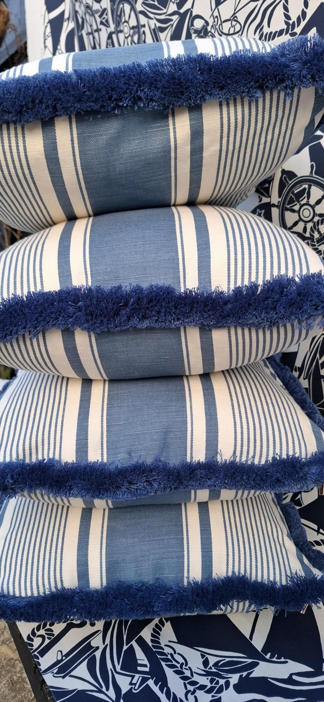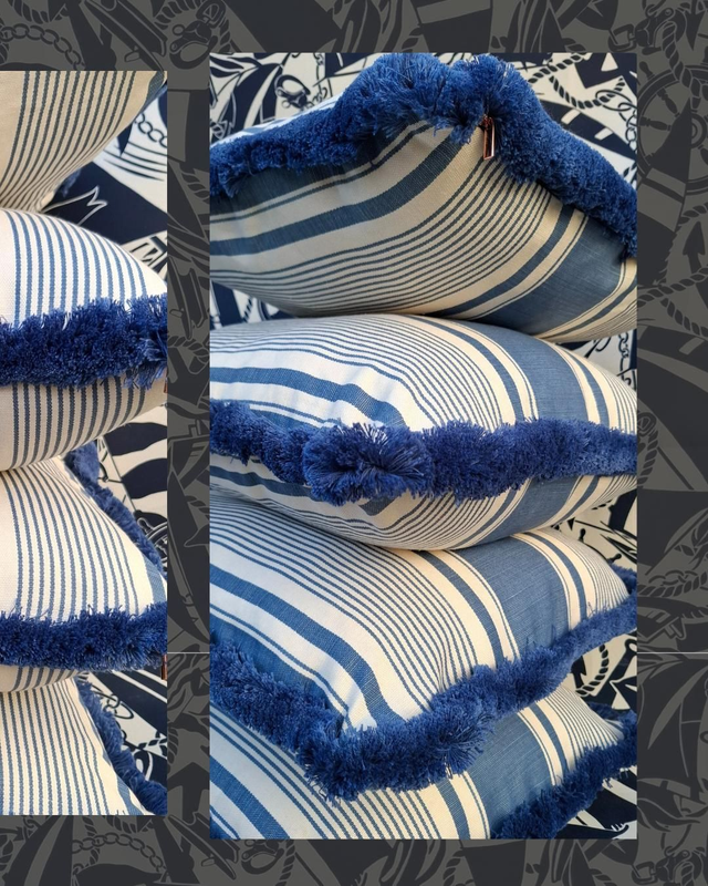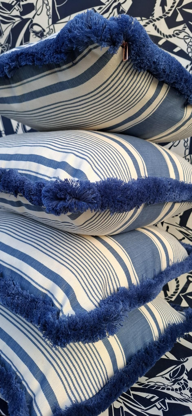 Blue & white striped square cushion cover, with a thick cotton fringe.